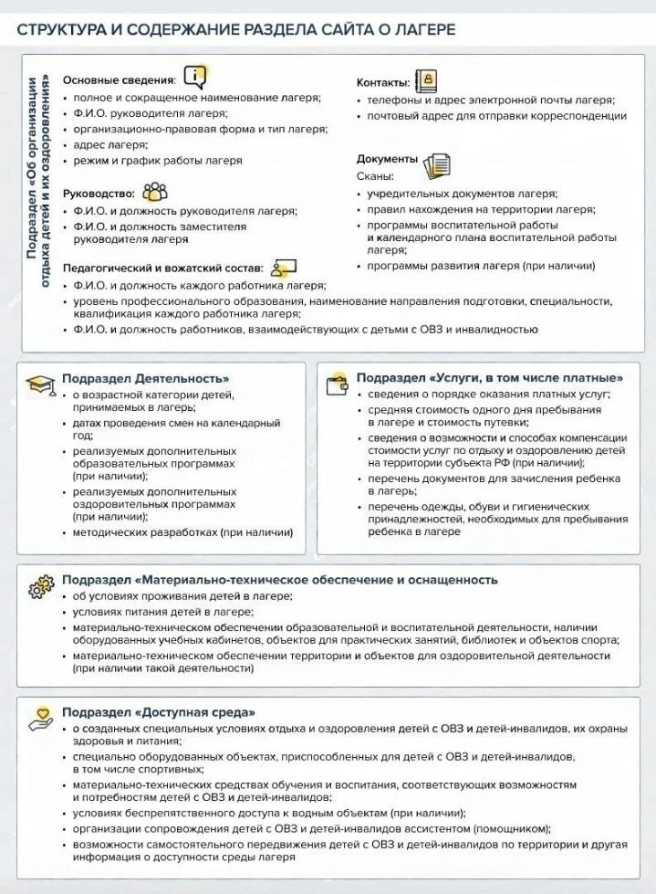 Режим работы лагеря: с 8.30 до 14.3 0Пакет предоставляемых документов: заявление родителей о приёме ребенка в лагерь, справка о прививках (прививочный сертификат), справка об эпидемиологическом окружении( действительна в течение 3 суток до приёма ребенка в лагерь)